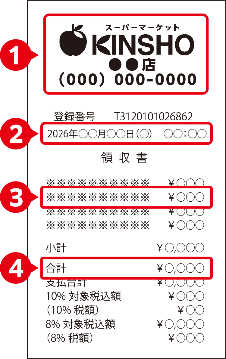 レシートは「購入店舗情報(店舗名・電話番号)」「購入日時」「購入商品名・金額」「合計金額」が分かるように撮影してください。