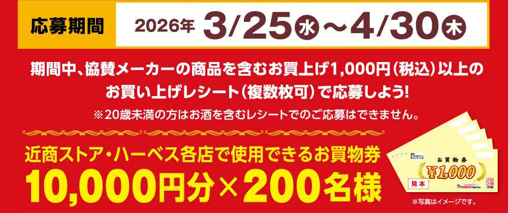キャンペーン期間中、対象店舗【近商ストア/ハーベス各店舗・ポシェット俊徳道店】にて1,000円(税込・合算可)以上のお買い上げレシートを、店頭設置の応募ハガキに貼付の上、郵便番号・ご住所・お名前(フリガナ、フルネーム)・性別・年齢・電話番号・お買い上げ店名をご記入の上、店頭設置の応募箱に投函してください。