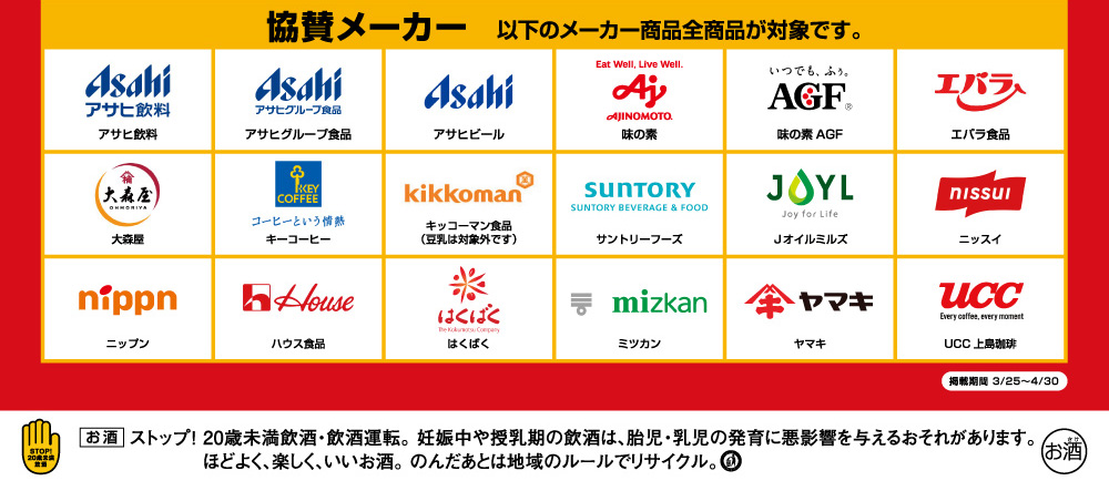 キャンペーン期間中、対象店舗【近商ストア/ハーベス各店舗・ポシェット俊徳道店】にて1,000円(税込・合算可)以上のお買い上げレシートを、応募ハガキまたは郵便ハガキに貼付の上、郵便番号・ご住所・お名前(フリガナ、フルネーム)・性別・年齢・電話番号・お買い上げ店名をご記入の上、郵送にてご応募ください。