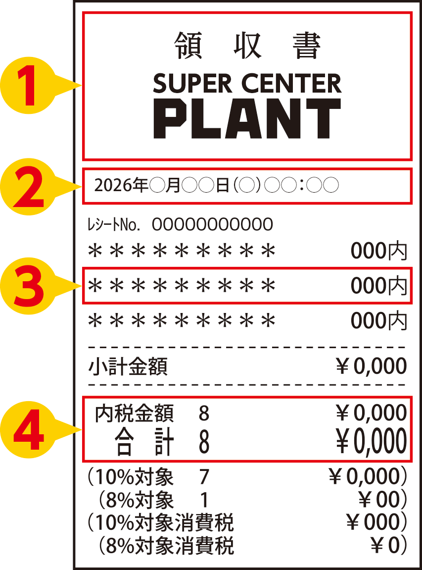 レシートは「PLANTロゴ」「購入日時」「購入商品名・金額」「合計金額」が分かるように撮影してください。