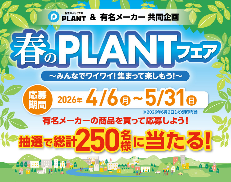 キャンペーン期間中、対象商品【協賛メーカー全商品】1品以上を含む2,000円(税込)以上のPLANT各店舗のお買い上げレシート(複数枚可)を1口として、レシートを撮影していただき、専用Webサイトにご応募ください。