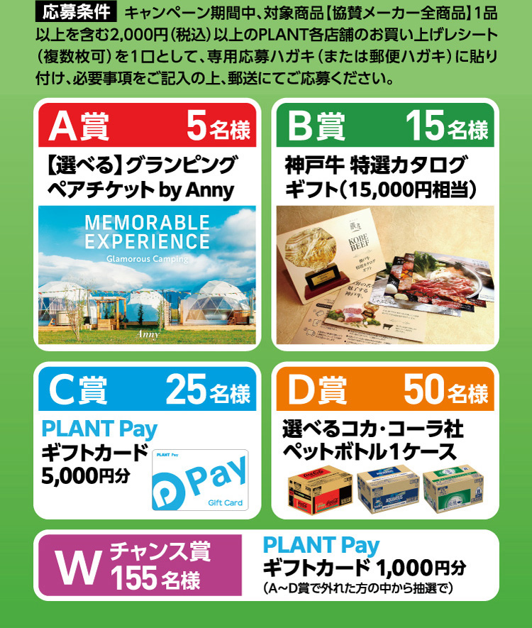 キャンペーン期間中、対象商品【協賛メーカー全商品】1品以上を含む2,000円(税込)以上のPLANT各店舗のお買い上げレシート(複数枚可)を1口として、応募ハガキまたは郵便ハガキに貼付の上、郵便番号・ご住所・お名前(フリガナ、フルネーム)・年齢・電話番号・お買い上げ店名・ご希望賞品をご記入の上、郵送にてご応募ください。