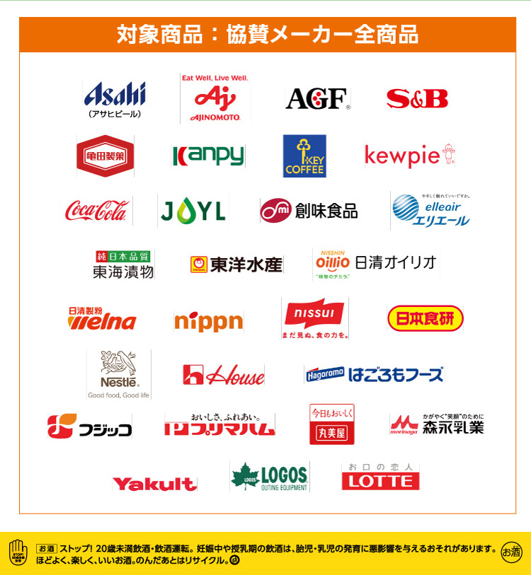 協賛メーカー:アサヒビール、味の素、味の素AGF、エスビー食品、亀田製菓、カンピー(加藤産業)、キーコーヒー、キユーピー、コカ・コーラ、Jオイルミルズ、創味食品、大王製紙、東海漬物、東洋水産、日清オイリオグループ、日清製粉ウェルナ、ニッスイ、ニップン、日本食研、ネスレ日本、ハウス食品、はごろもフーズ、フジッコ、プリマハム、丸美屋食品、森永乳業、ヤクルト、ロゴス、ロッテ